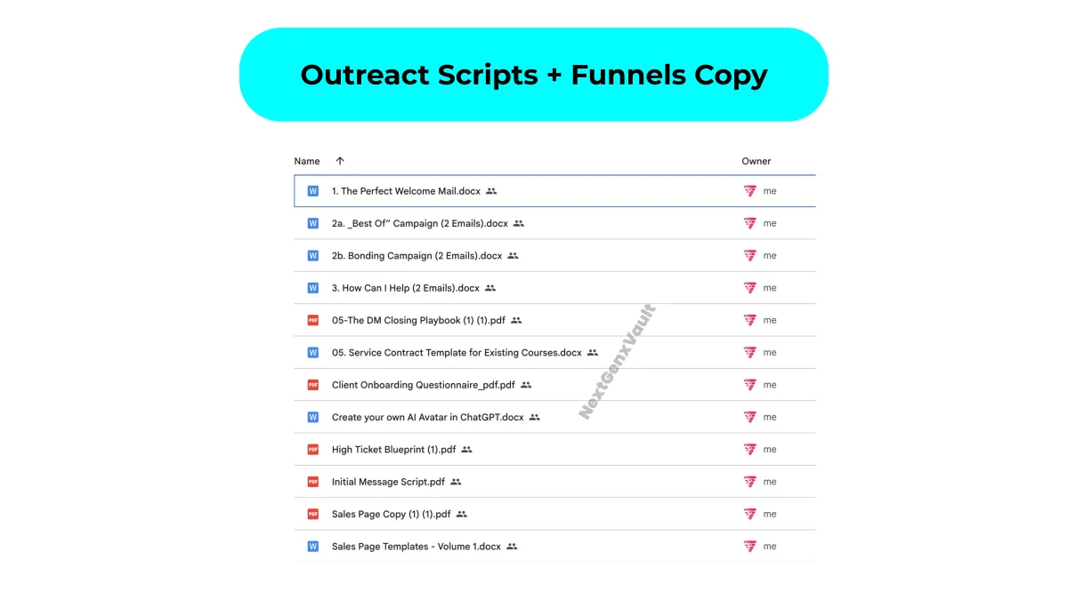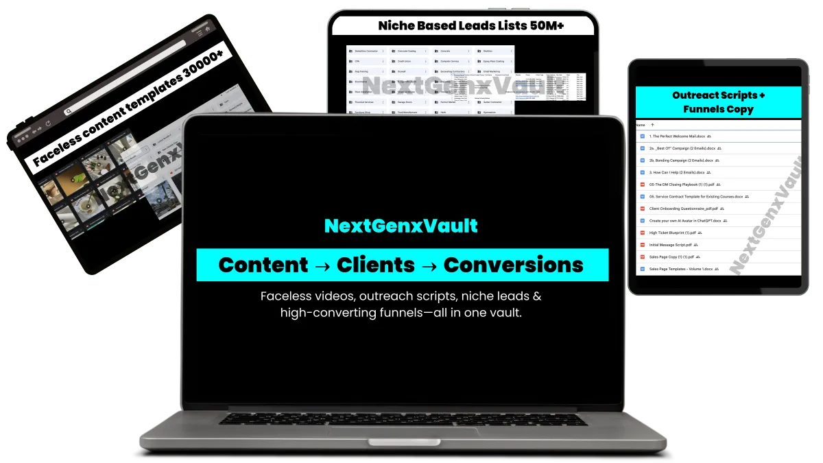 Here are actual examples from NextGenxVault - premium video templates ready to post, Outreach Scripts - Lead Lists And a Funnels Copy, Software to transform your Business