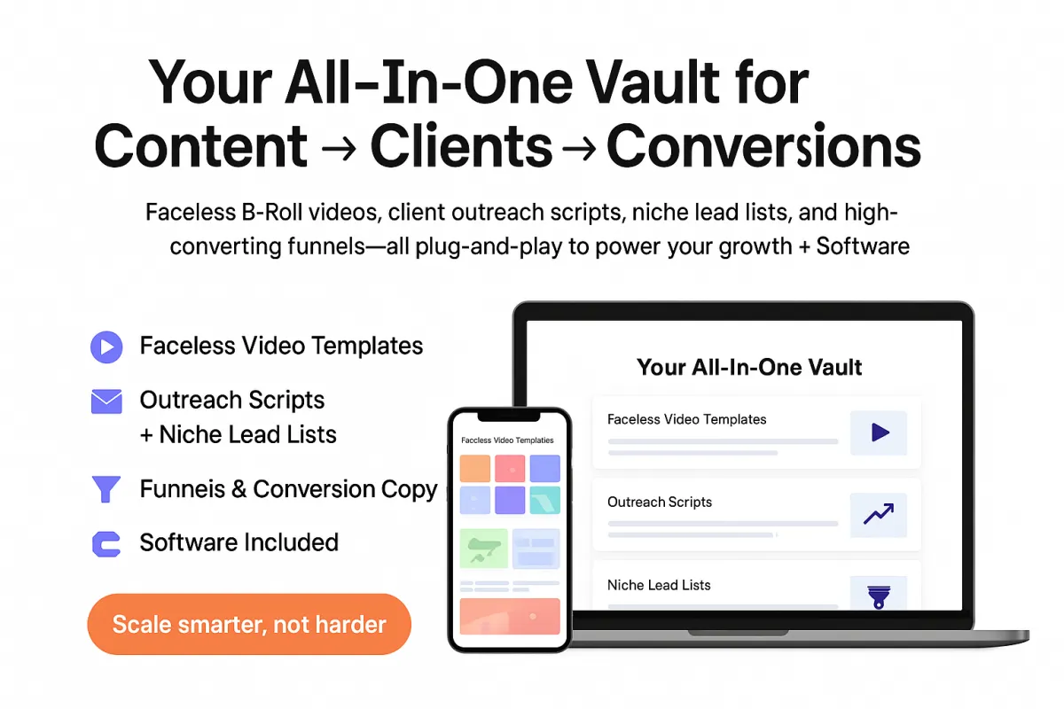 30000+ Faceless B-Roll videos+Posts, client outreach scripts, niche lead lists, and high-converting funnels—all plug-and-play to power your growth + Software